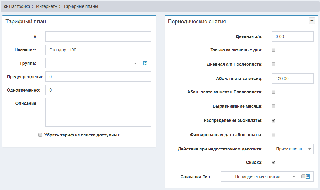Создание тарифа “Акция”: переходим в меню Настройка>Интернет+>Тарифные планы>Добавить. В форме создания тарифного плана заполняем: