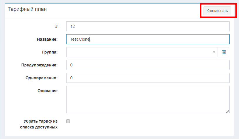 | Убрать тариф из списка доступных | Скрывает тариф из списка доступных, при смене тарифного плана и при добавлении сервиса. Тариф убирается так-же и в админке, его можно найти только в списках тарифных планов. |