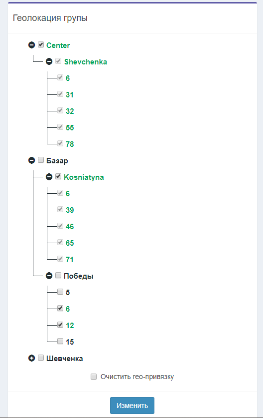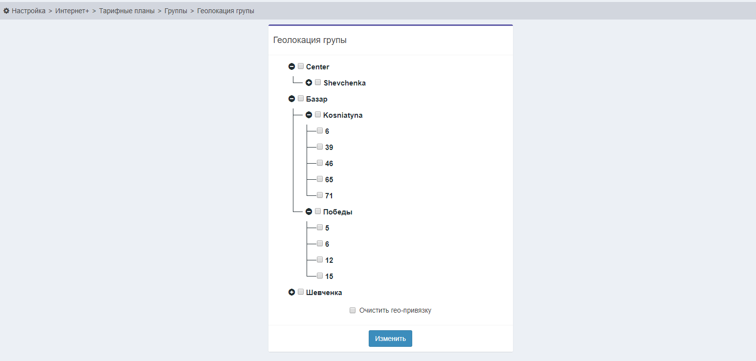 Нужно поставить галочку возле надписи "Очистить гео-привязку" и нажать Изменить, чтобы удалить привязку для данной группы тарифных планов.