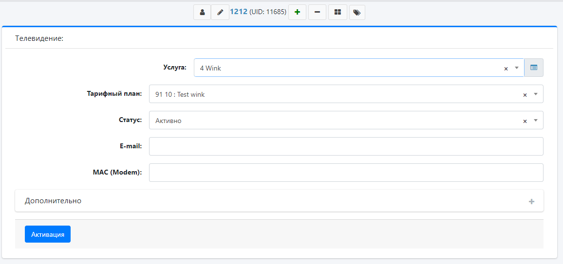Выбираем сервис Wink. Вводим необходимые данные. В поле Filter id вносим id тарифа в системе Wink.