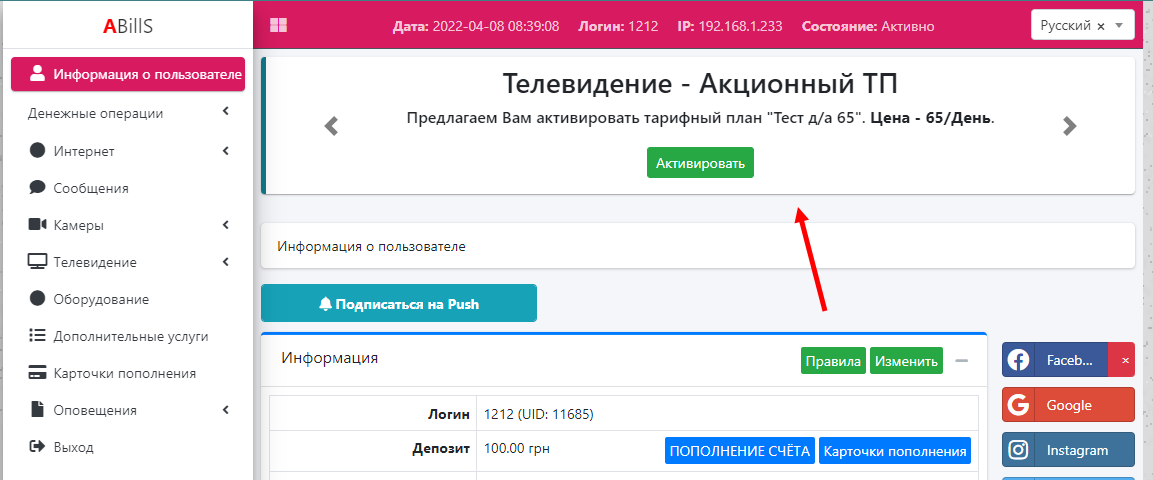 После чего у пользователя в ЛК отобразится следующая панель.