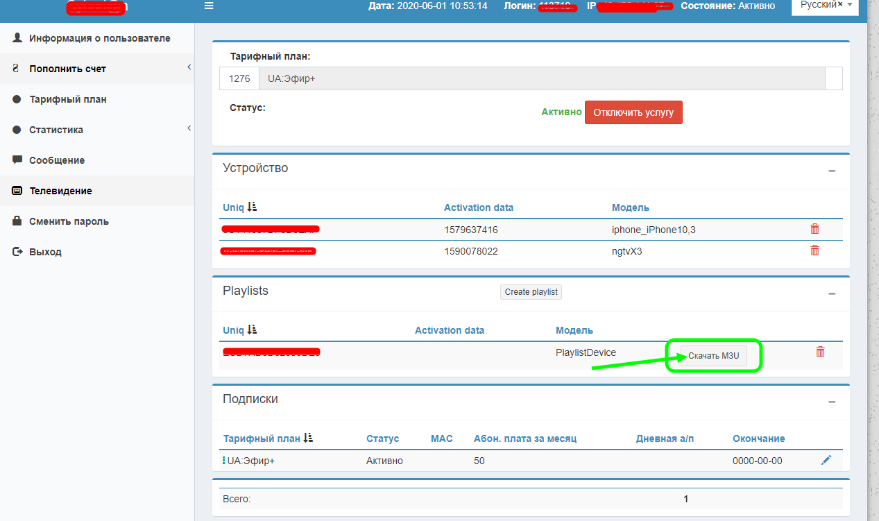 В панели администратора отображается в активированом сервисе Omega TV пользователя.