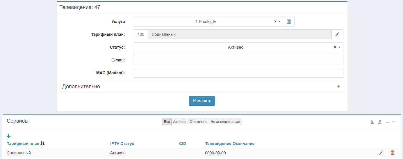 В панели администратора отображается в активированом сервисе Prosto TV пользователя.