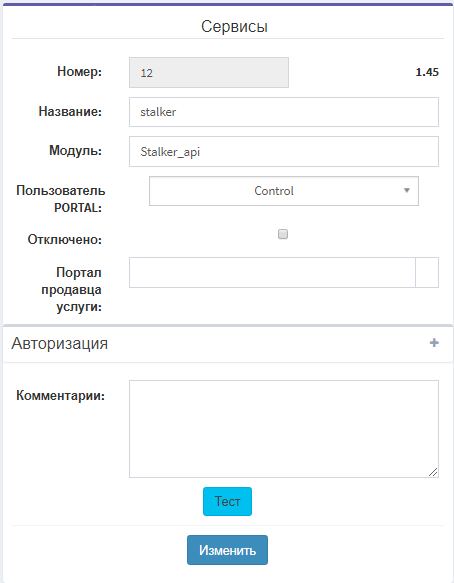 После заведения сервиса нажмите на кнопку Карандаша напротив него в списке созданных сервисов ниже, для повторного открытия модального окна и отображения кнопки Тест. Нажимаем на кнопку Тест для поверки работоспособности модуля.