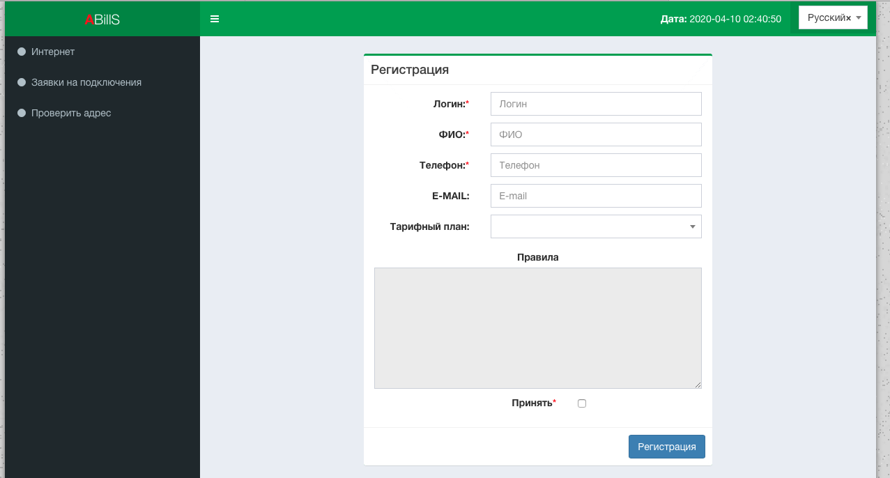 После регистрации абоненту отправляются данные для входа в систему (Логин и пароль)
