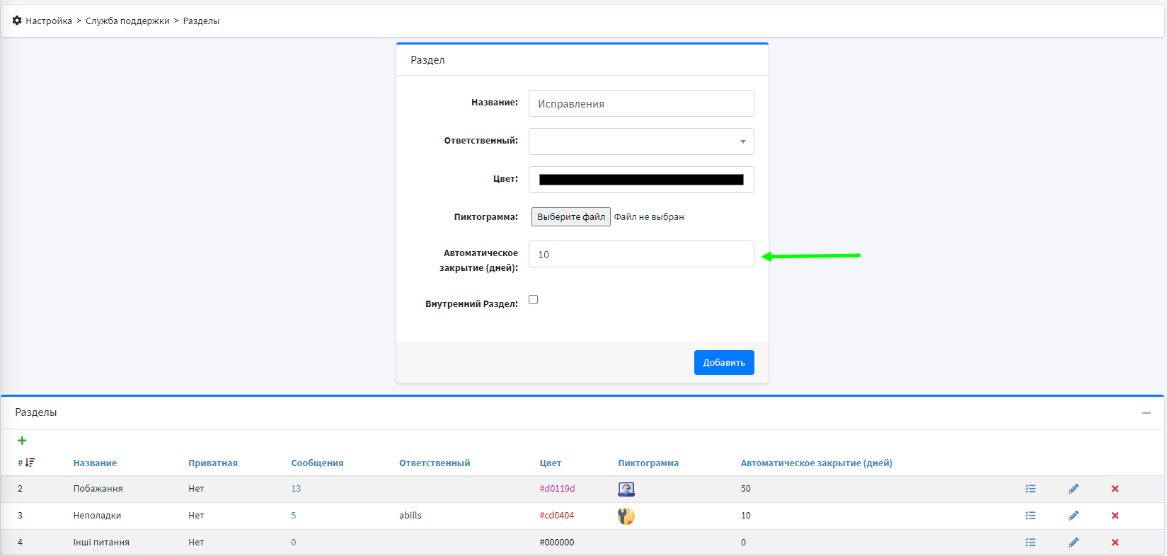 Для начала, перейдите в настройки разделов и укажите период автоматического закрытия сообщений.