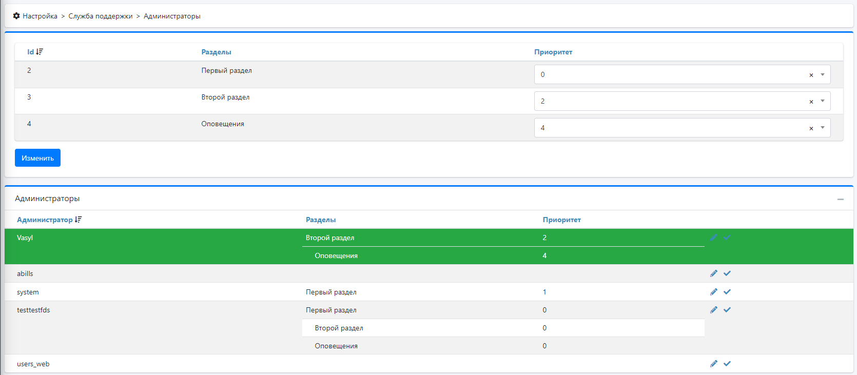 | Приоритет | Приоритет компетенции администратора. 0 - самый низкий приоритет. Администраторы с низким приоритетом не видят заявки переадресованные администраторам с более высоким приоритетом компетенции. Например, если менеджер не может решить задачу, он отправляет её на уровень выше, где её рассматривают сотрудники с более высокой квалификацией |