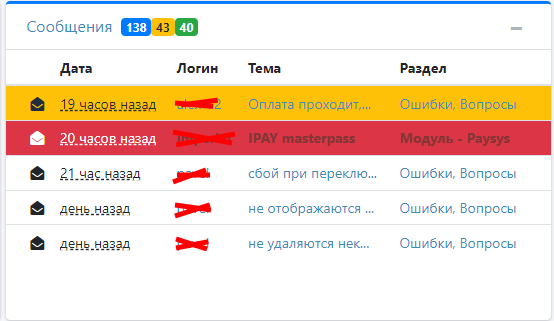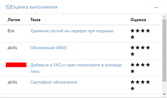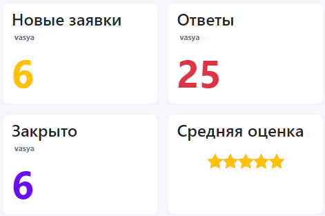 Отображает новые сообщения, ответы, закрытые сообщения и среднюю оценку текущего администратора за текущий месяц.