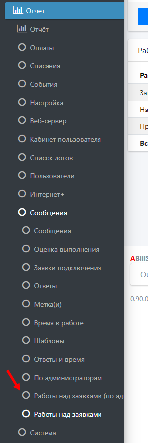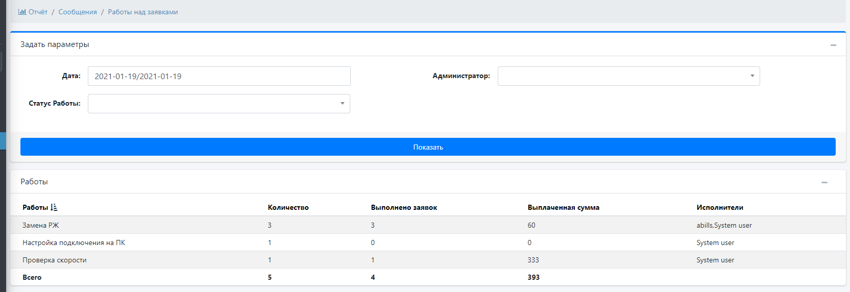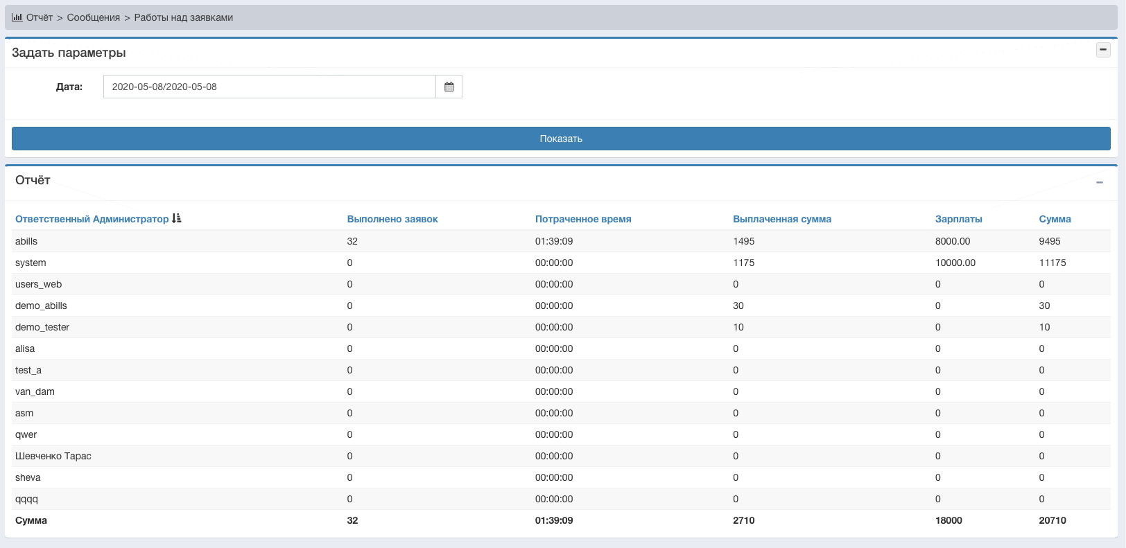 Чтобы посмотреть отчет по роботе над заявками зайдите в Отчёт → Сообщения → Работы над заявками (по администраторам) как показано ниже на скриншоте