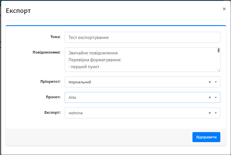 Позволяет переносить заявки из модуля Msgs в задачи Redmine. Для экспорта, нажмите на кнопку «Экспорт» в панели управления сообщением (справа)