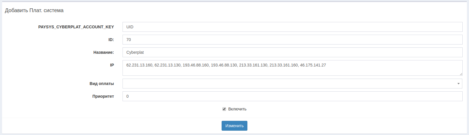 >Paysys>Настройки Добавить платежную систему