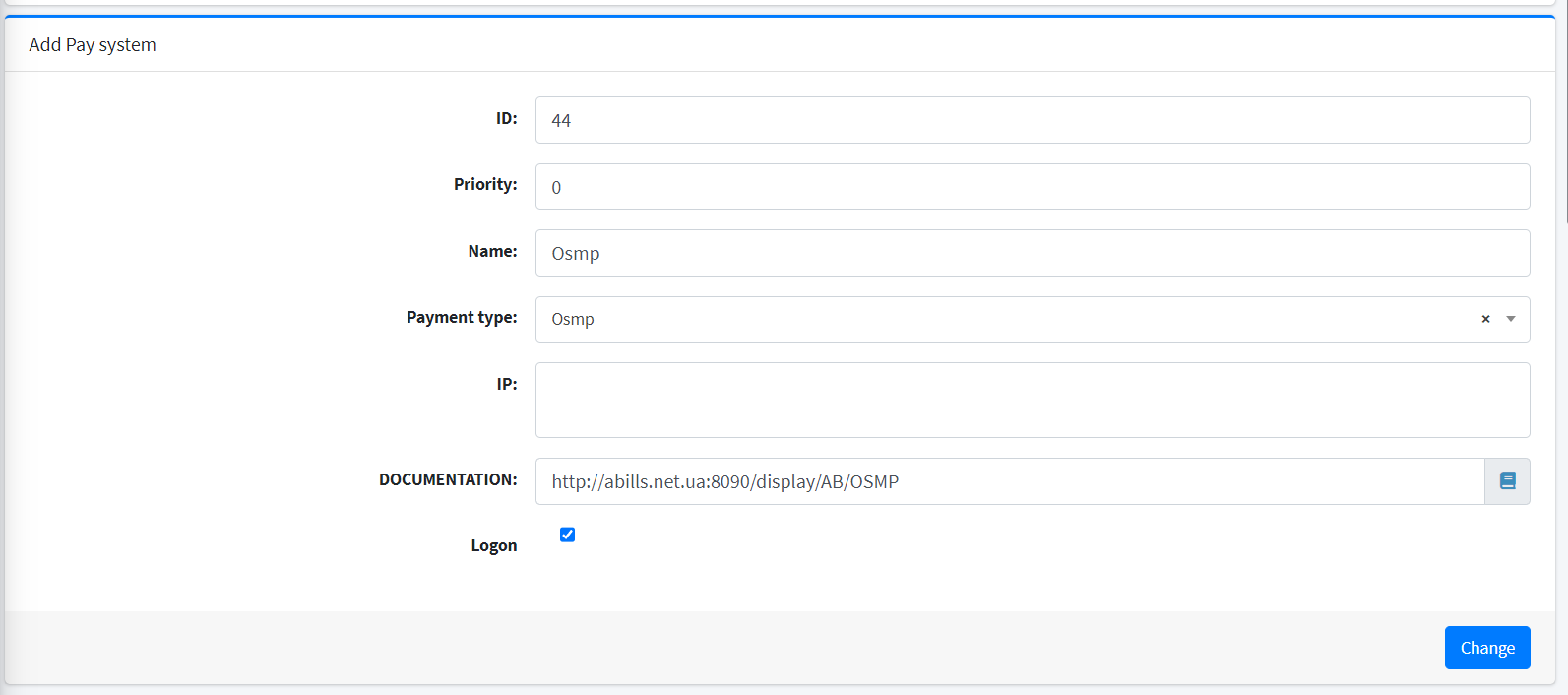 Наследование настраивается так же, как и сам модуль OSMP. При настройке в меню Настройки>Paysys>Настройки различия будут в том, что нужно внести ID (уникальное значение в вашей системе), НАЗВАНИЕ и IP платежной системы, которая настраивается.