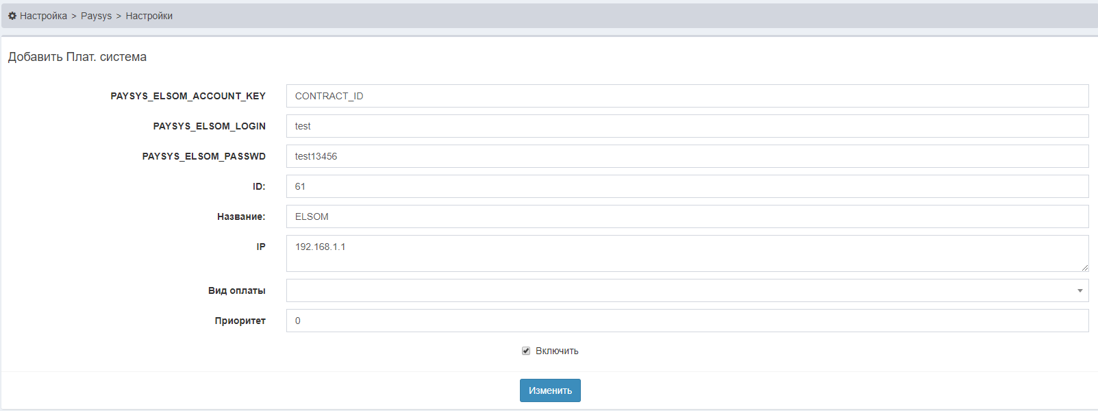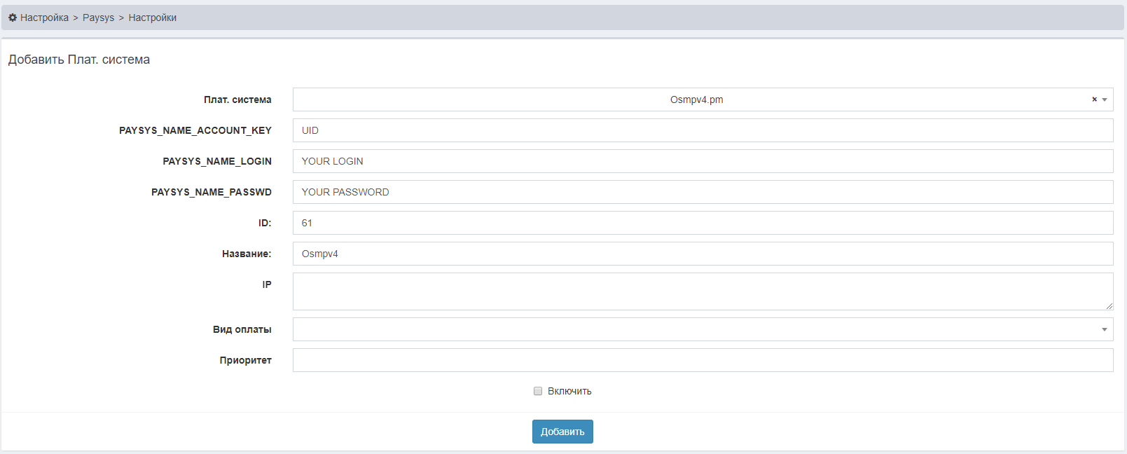 Наследование настраивается так же, как и сам модуль OSMPv4. При настройке в меню Настройки>Paysys>Настройки различия будут в том, что нужно внести ID (уникальное значение в вашей системе), НАЗВАНИЕ и IP платежной системы, которая настраивается.