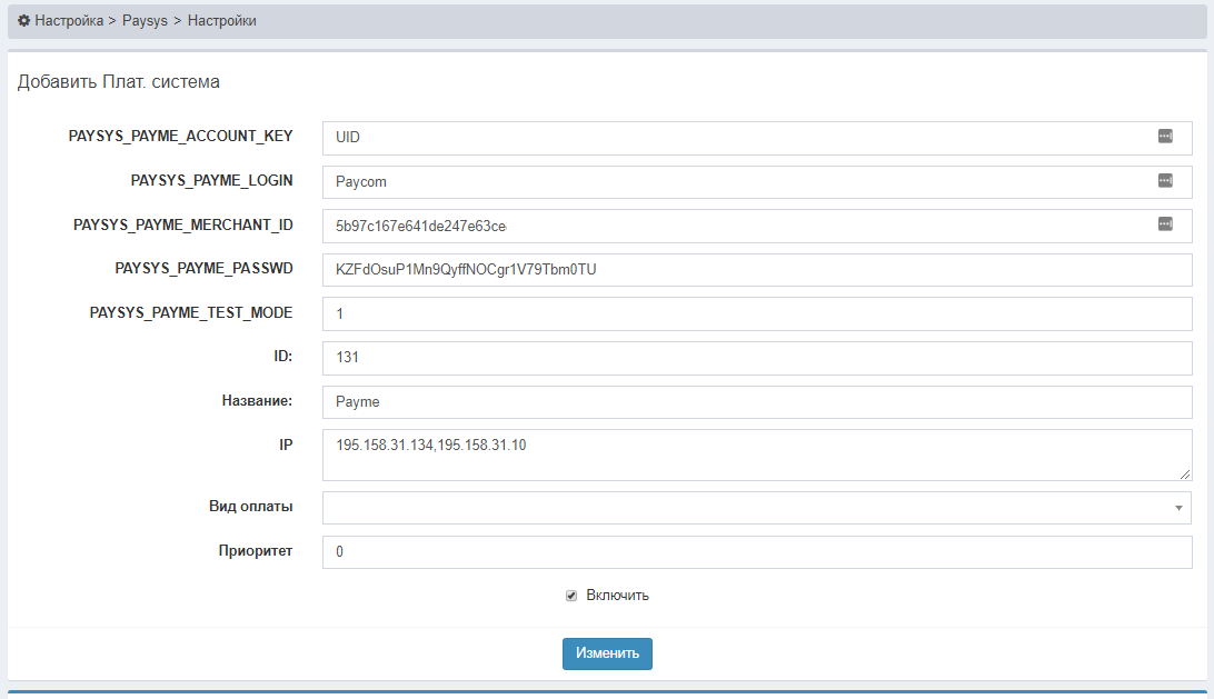 | IP | IP адреса с которых система будет отправлять запросы. Информация из документации Payme: 195.158.31.134,195.158.31.10 |