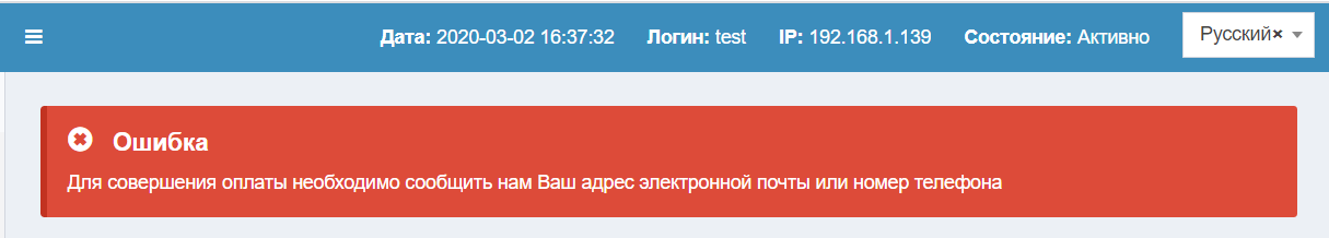 При регистрации в Яндекс.Кассе можно включить фискализацию (абонент будет получать на адрес электронной почты или телефон подтверждение оплаты услуг - чек об оплате). Для этого необходимо, чтоб в биллинге у абонента был прописан или "Телефон" или "EMail". Если эта информация отсутствует, то при оплате появится сообщение: