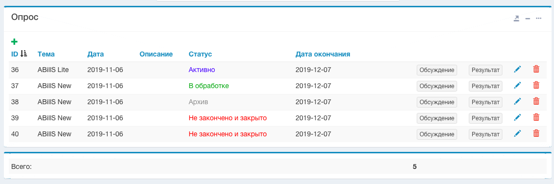 В таблице опросов, администратор может перейти на вкладки просмотра результатов голосования и обсуждения: