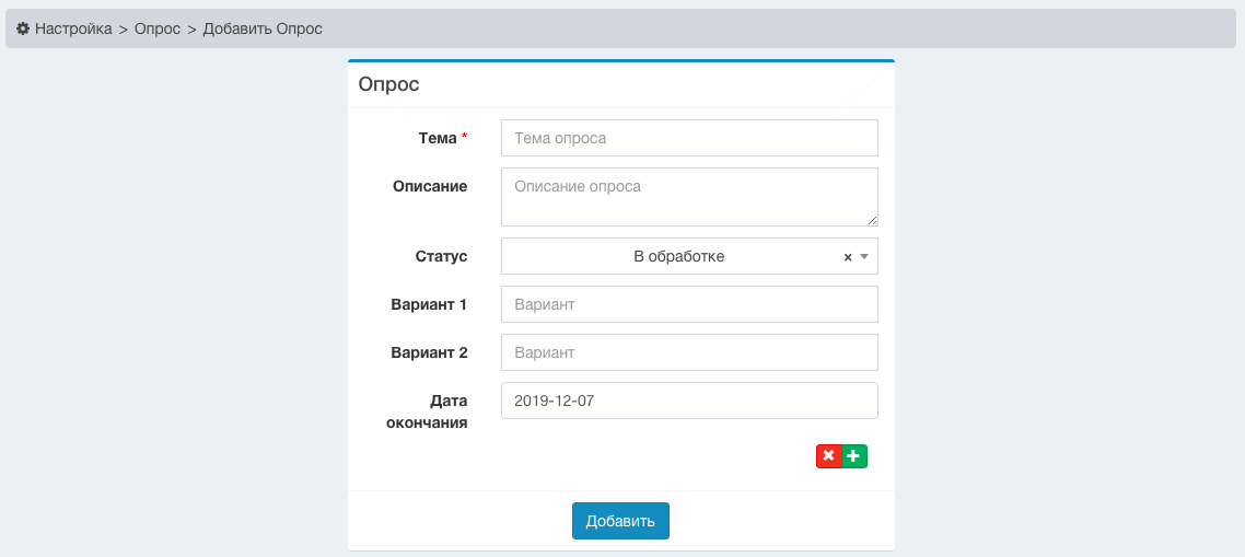 Заходим в меню Настройка>Опрос>Добавить опрос и видим форму добавления опроса: