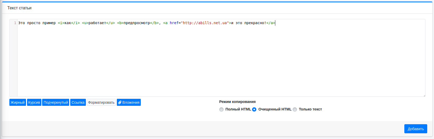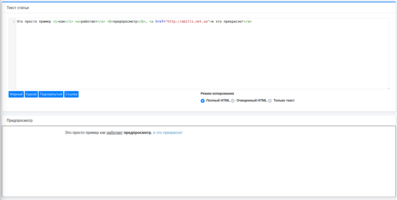 - Очищенный HTML — тэги копируются практически без атрибутов (исключение: href), удаляются системные тэги;