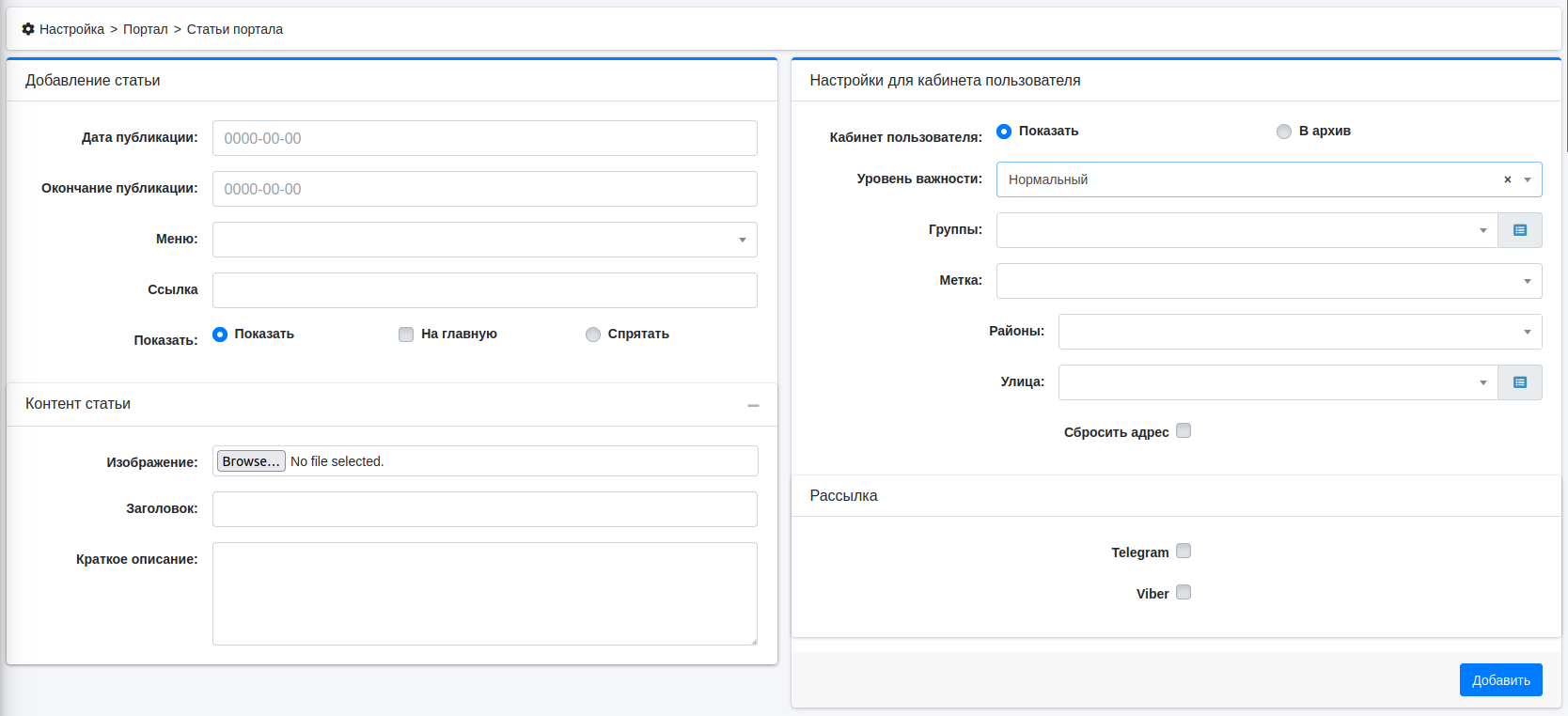 Дата публикации — с какой даты статья должна отображаться на портале, работает только если установлен параметр «Показать», в случае если параметр будет «Спрятать» - статья не будет показываться в независимости от даты