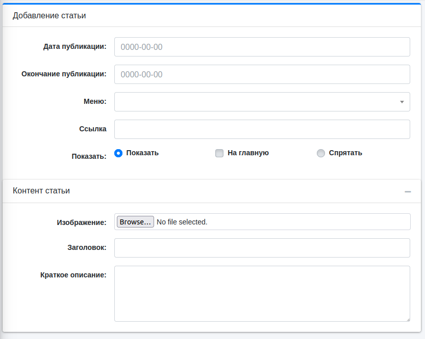 Меню — спадающий список меню, определяет, в каком пункте меню будет публиковаться статья