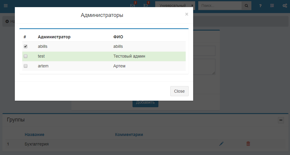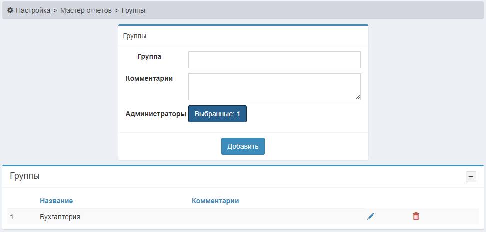 Для удобства использования отчёты разделены на группы. Для каждой из групп можно указать администраторов, которые могут их просматривать. Отчёты без группы или отчёты в группе, где не выбрано ни одного администратора, будут видны всем администраторам.
