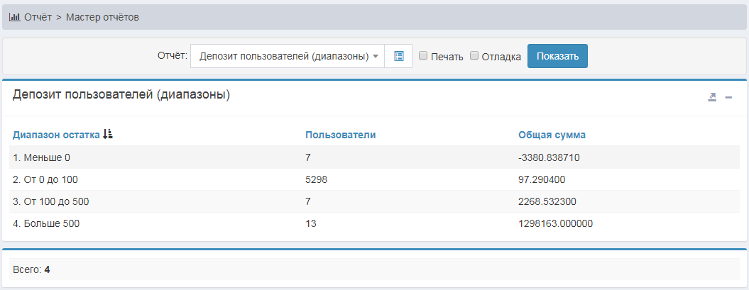 Отчет показывает количество абонентов с размером депозита в указанных диапазонах. В данном примере используется 4 диапазона: Меньше нуля, от 0 до 100, от 100 до 500 и больше 500.