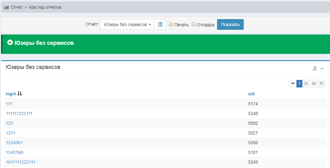 Отчет находит всех пользователей добавленных в систему без сервиса (в данном примере проверяются сервисы интернет и iptv).