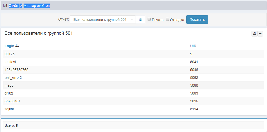 Пример, отчёт по логинам и UIDам группы 501.