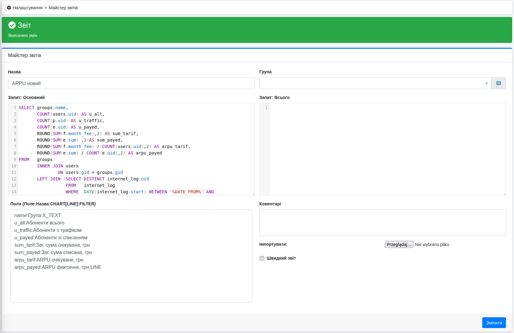 | Импорт: | Можно импортировать отчёты из файлов. Также можно предоставлять другим свои отчёты. При импорте можно указать название отчёта и описание, которое будет отличаться, от тех что в файле импорта. |