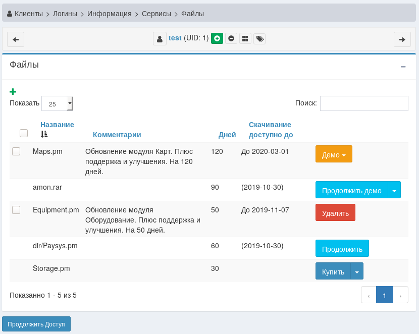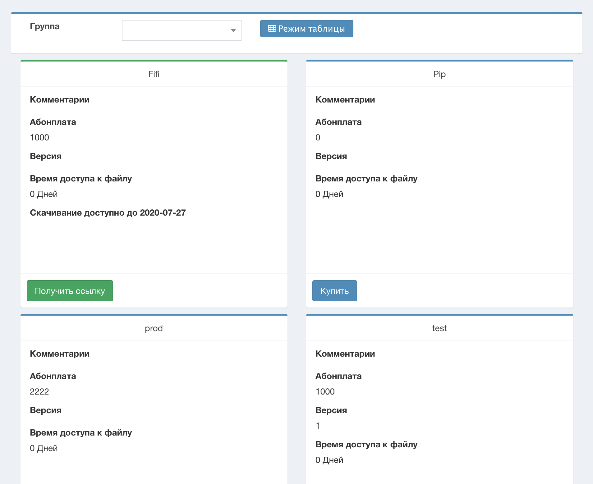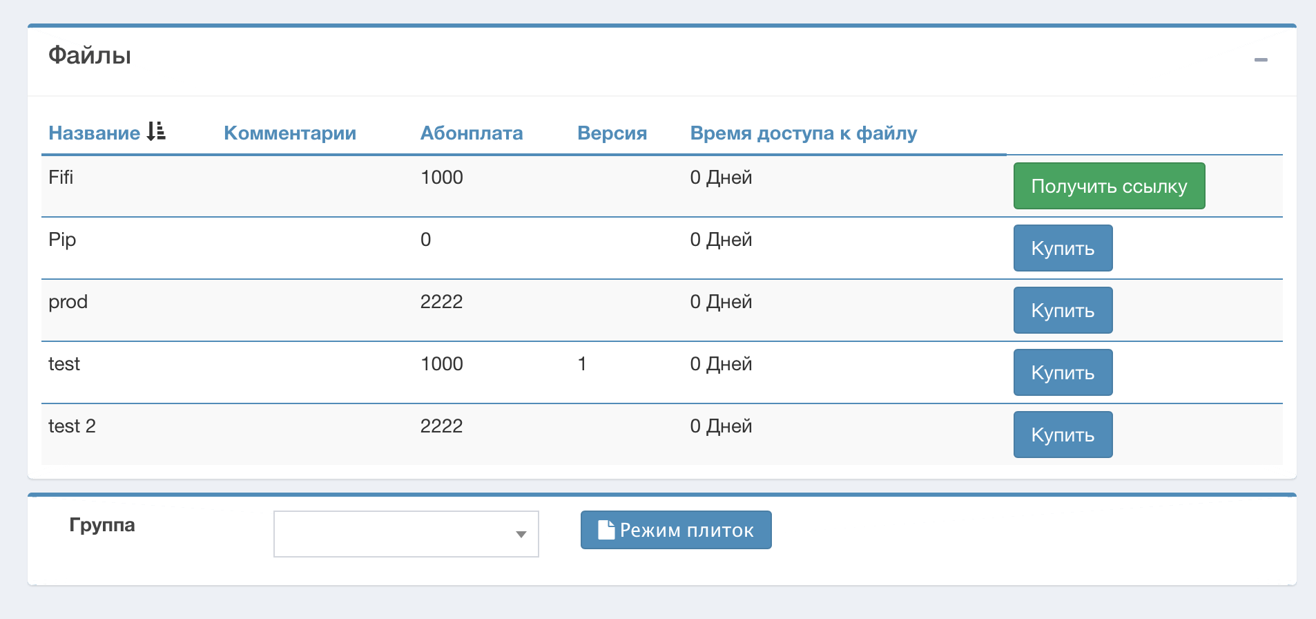 После того, как мы создадим данную запись, положим файл в папку, которую прописали в конфиге, абонент сможет оплатить покупку и скачать данный файл прямо с клиентского кабинета. Теперь абонент может фильтровать файлы по группам, выбрав в селекте нужную ему группу.