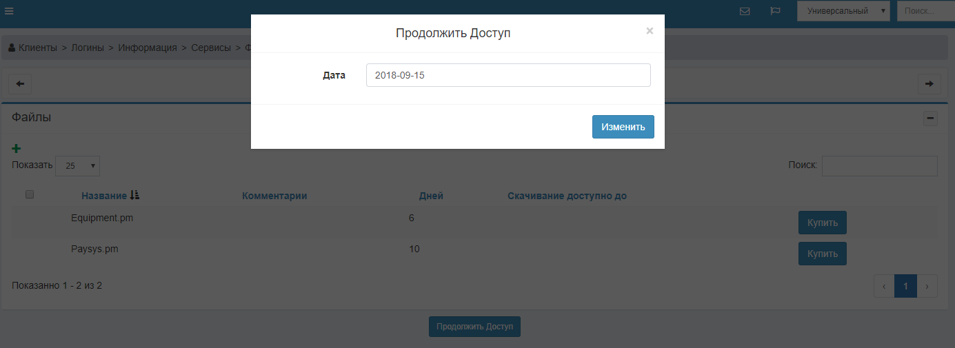 Если вы хотите продлить или изменить дату, до которой абоненту дан доступ для скачивания - отметьте нужные вам файлы чекбоксами и нажмите кнопку Продолжить доступ. Появится модальное окно в котором вы выберете дату и нажмите Изменить.