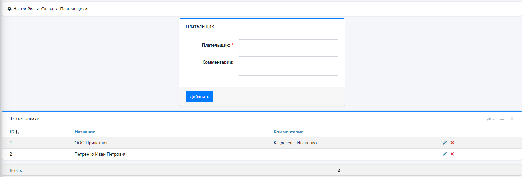 Чтобы добавить плательщиков, используйте меню Настройка>Склад>Плательщики.