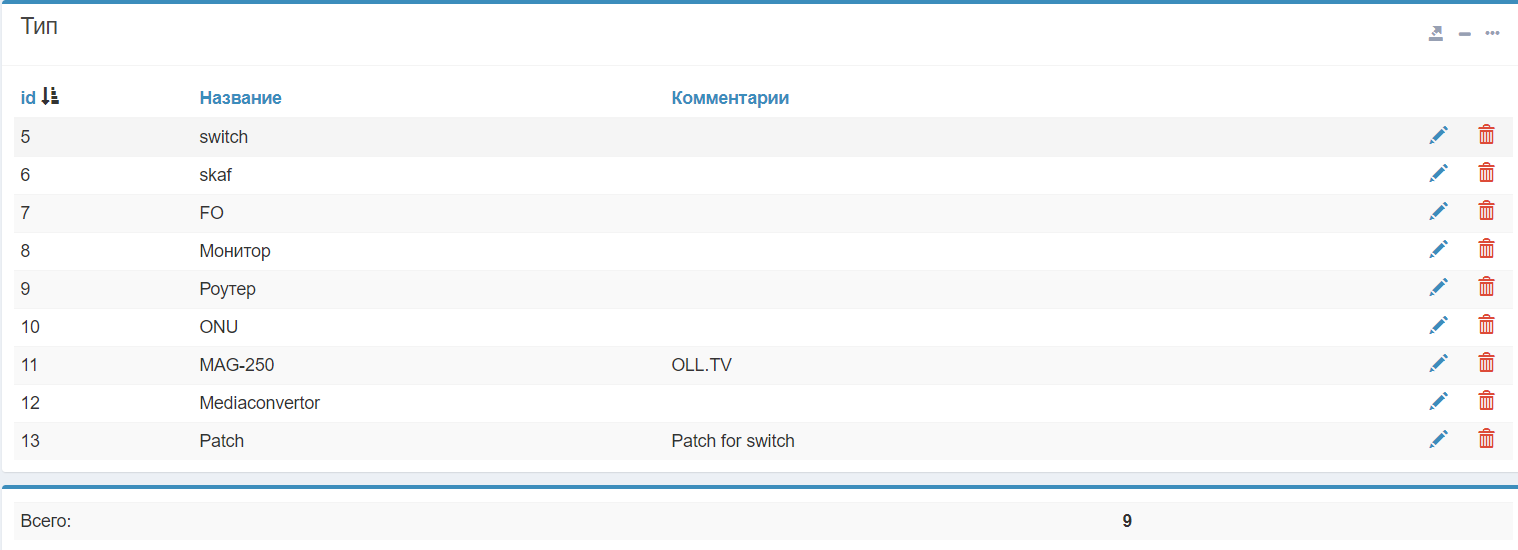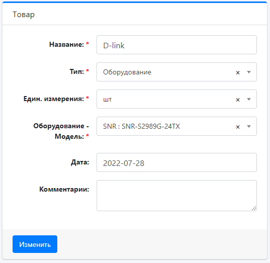 Для добавления товара на склад используются два параметра: Тип товара и Название товара. Сначала нужно заполнить Тип товара (примеры: switch, ONU, роутер ), и только после этого, можно добавлять Название товара (примеры: sf300-24, ONU-GEPON, TP-LINK 840N). Тип товара используется при добавлении Названия товара!