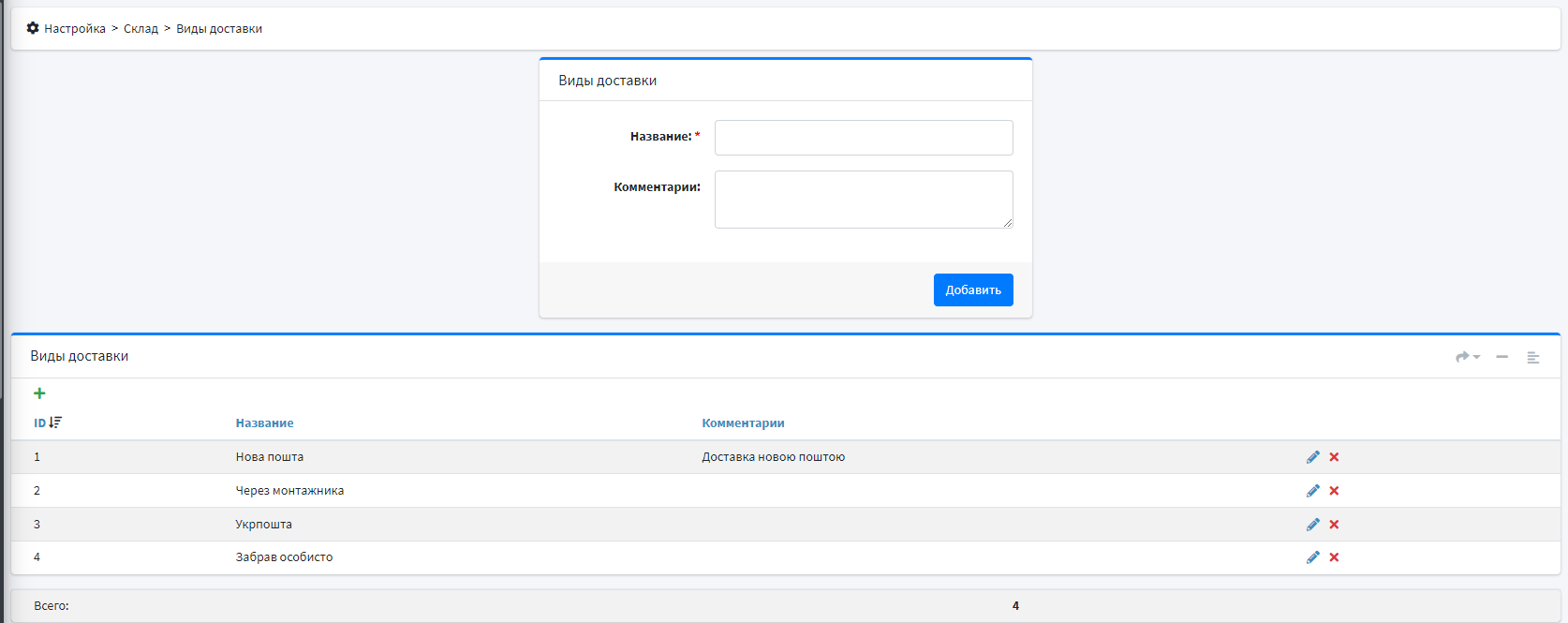 Чтобы добавить вид доставки переходим в меню Настройка>Склад>Виды доставки.