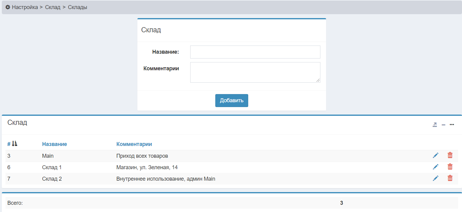 После установки модуля Склад у Вас в меню Настройка>Склад>Склады уже будет, созданный по умолчанию, склад Main. При желании склад Main можно переименовать или удалить.