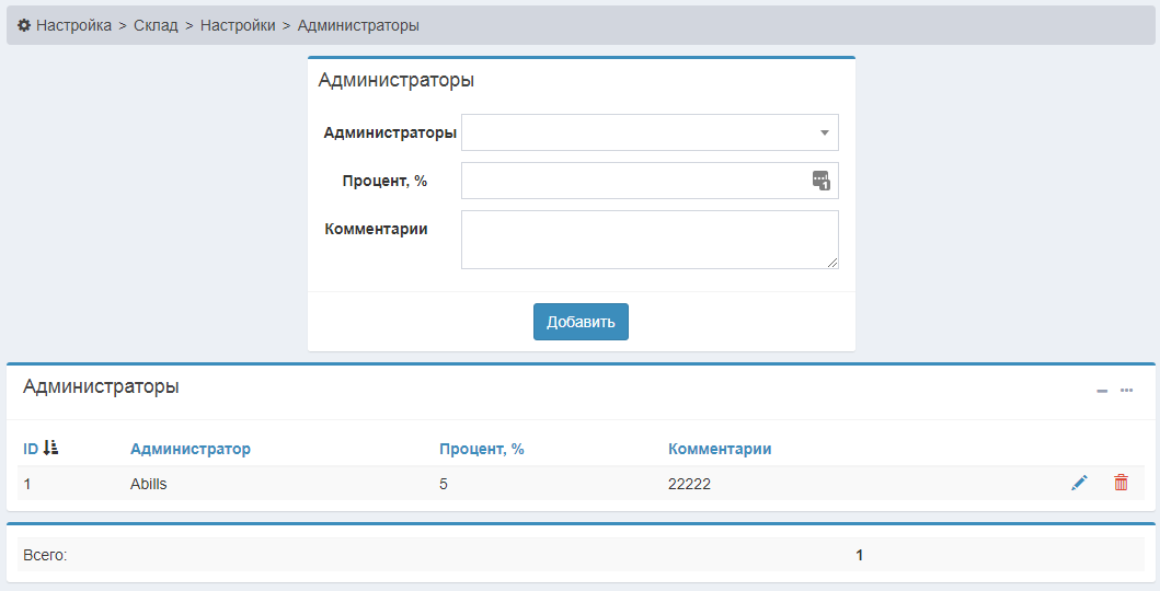 Данный раздел меню предусматривает дополнительные настройки для администраторов, которые работают со складом. В частности, для настройки % личного дохода администратора от продажи товара со склада.