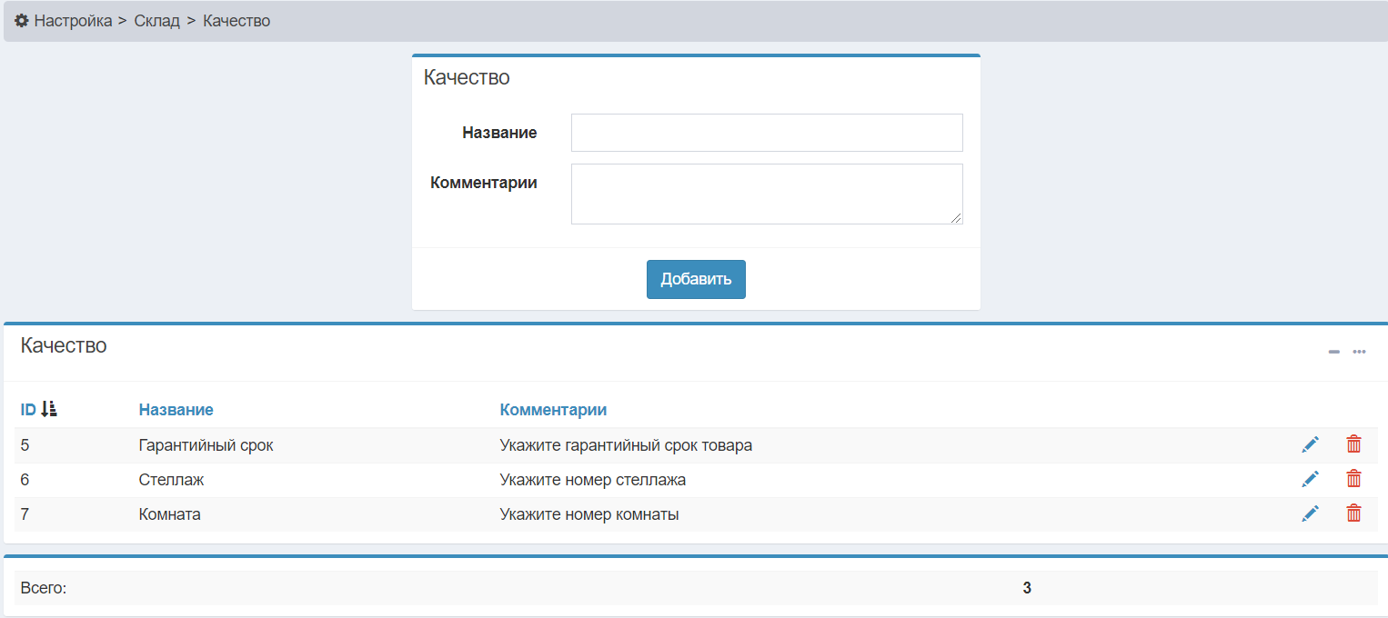 В данном меню также формируется список всех дополнительный качеств товара, которые можно отредактировать или удалить , если эти качества не используются на складе.
