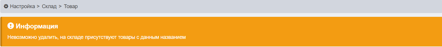 Все добавленные записи товаров можно отредактировать либо же удалить . В случае, если какой-либо из товаров уже используется на складе - его удаление не возможно. При попытке удалить товар, который уже используеься, на экране появится сообщение: