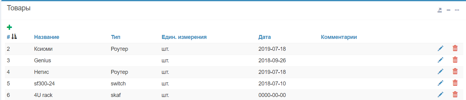 Для добавления товара - используем следующую форму, где заполняем название товара, выбираем из списка тип товара, выбираем единицы измерения товара, дата заполняется автоматически, вводим комментарий, если нужно: