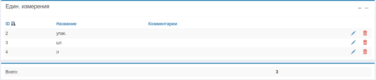После установки модуля Склад в меню Настройка>Склад>Един. Измерения уже будут, созданные по умолчанию, такие единицы измерения: шт., метр, см, мм, литр, ящики, которые при желании можно будет отредактировать либо же удалить .