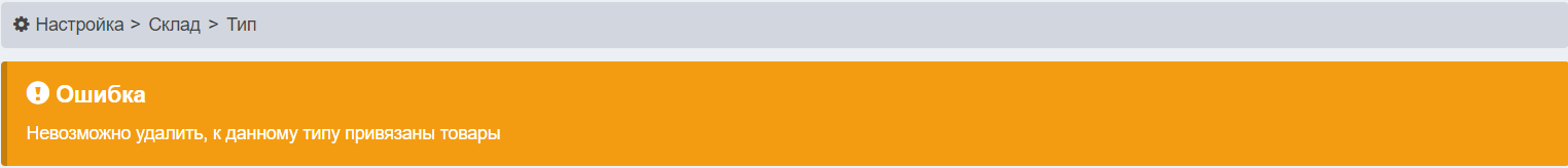 Все добавленные записи типов товаров можно отредактировать либо же удалить . В случае, если какой-либо из типов товаров уже используется на складе - его удаление не возможно. При попытке удалить тип товара, который уже используеься, на экране появится сообщение: