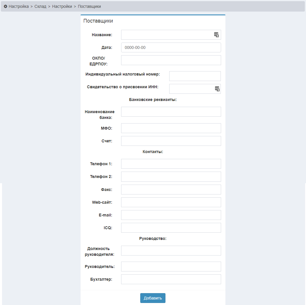 Чтобы добавить поставщиков, с которыми Вы работаете, используйте меню Настройка>Склад>Поставщики.