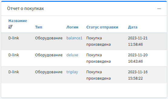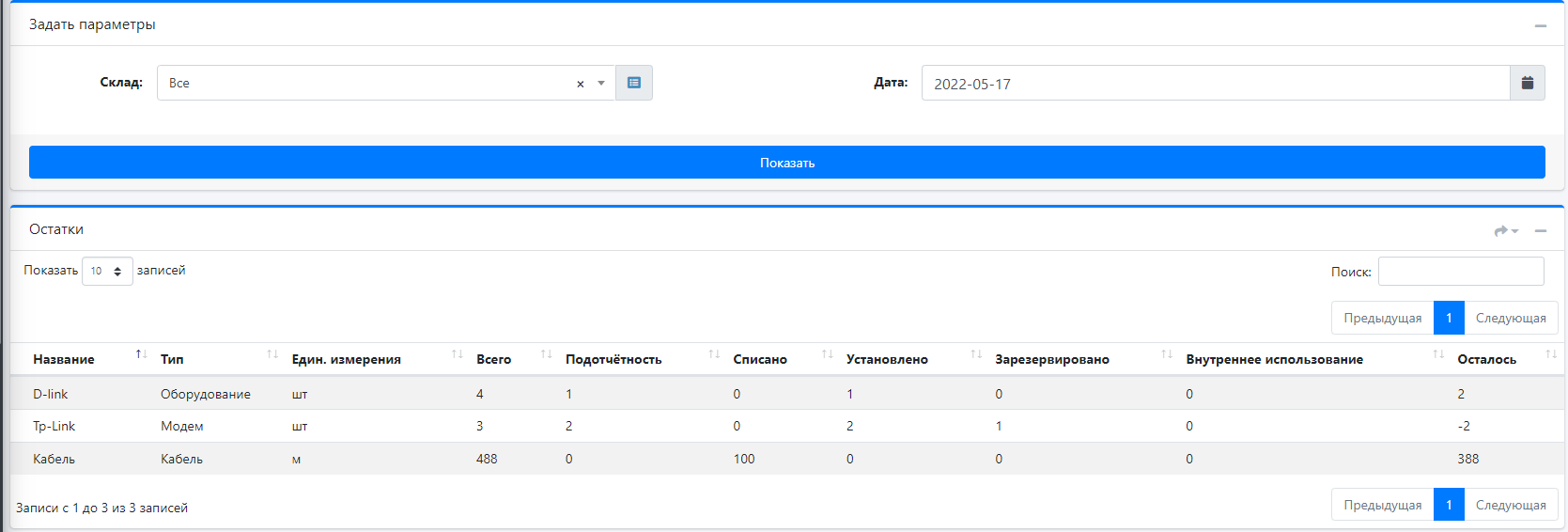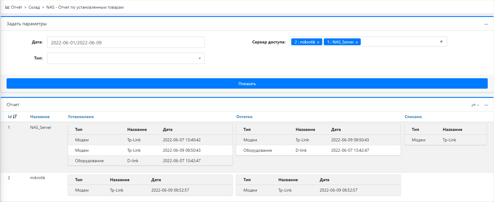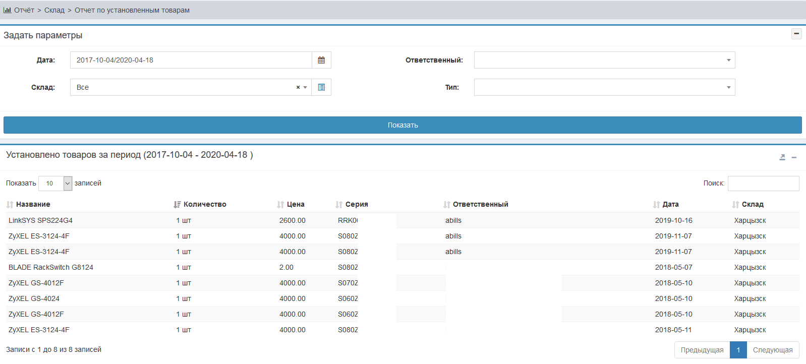 Данный отчет поможет определить количество установленных/списанных товаров та остатков на сервера доступа в заданный нами период времени и фильтрам. По умолчанию используется текущий месяц.
