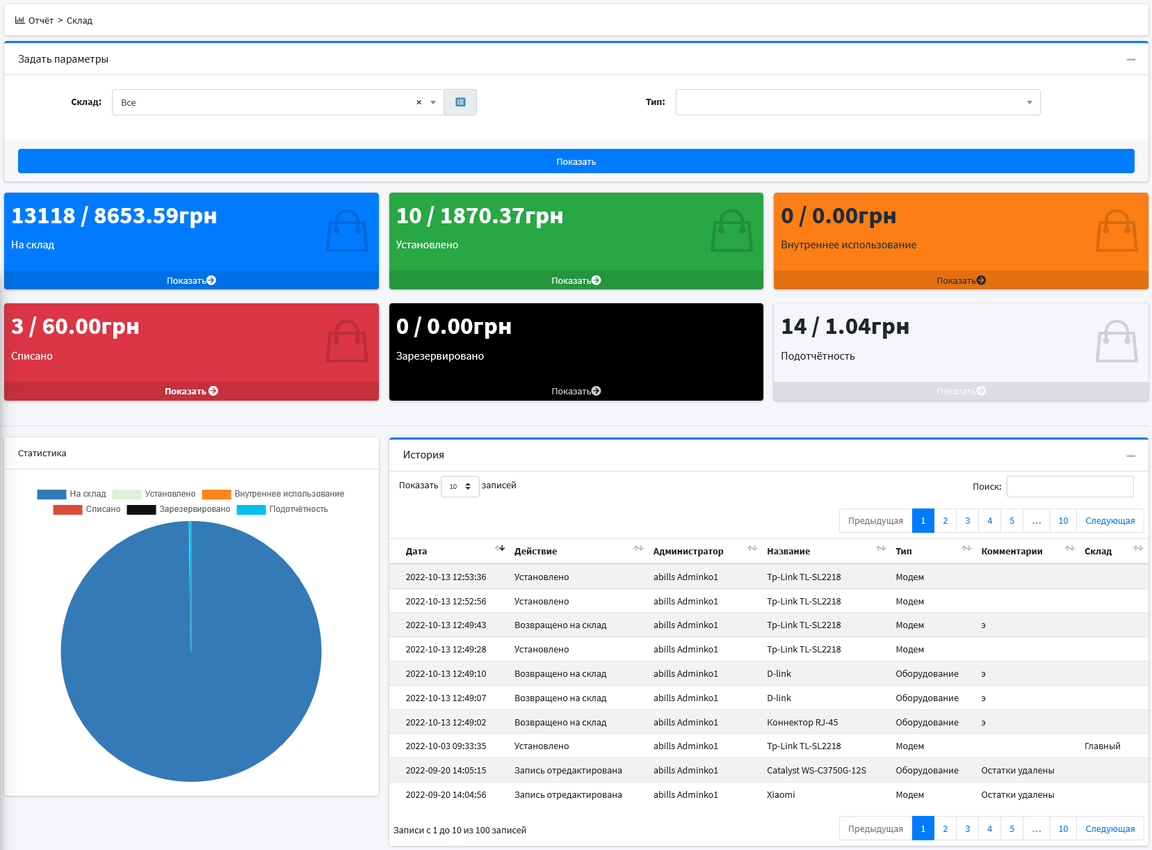 Отчет Статистика отображает историю действий с товарами на складе. В частности, отчет показывает сколько единиц товара находится на складе, и сколько единиц товара находится в других пунктах меню: Установлено, Внутреннее использование, Списано, Зарезервировано, Подотчетность.