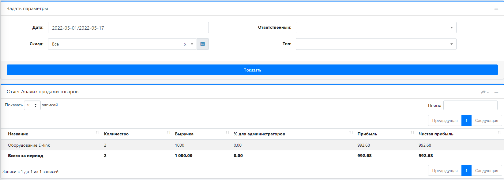 Отчет Анализ продажи товаров отображает количество проданного товара, выручку за реализованный товар, прибыль от реализованного товара, % администратора (продавца) от реализации товара, и чистую прибыль от реализации товара за минусом % администратора (продавца).