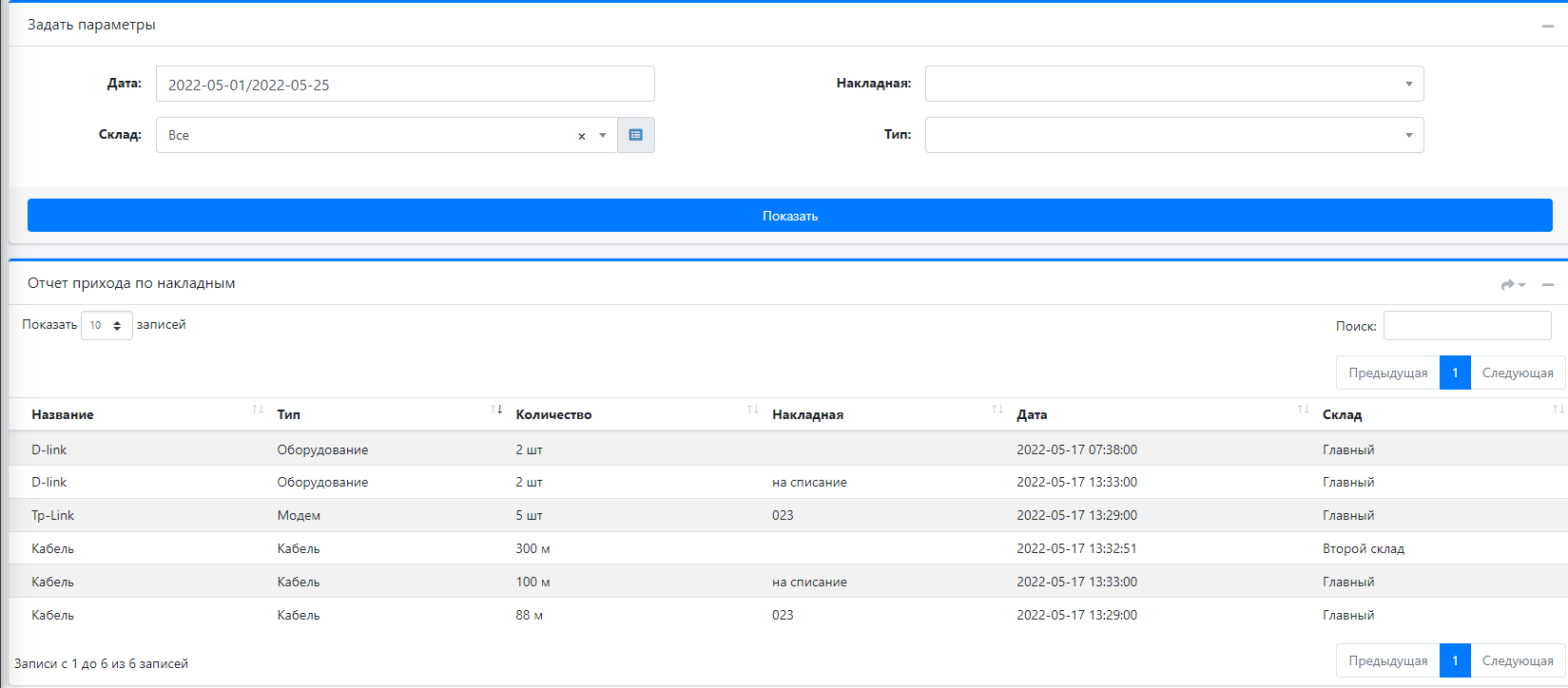 Данный отчет поможет определить сколько и какой товар пришел на склад в заданный нами период времени. Привязка идёт к накладным которые пришли в это время. По умолчанию используется сегодняшняя дата.