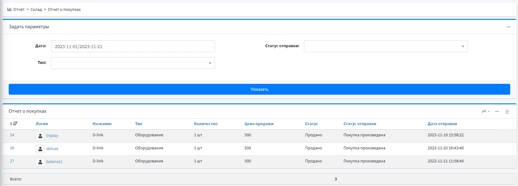 Данный отчет поможет определить количество установленных товаров в заданный нами период времени и фильтрам. По умолчанию используется сегодняшняя дата.
