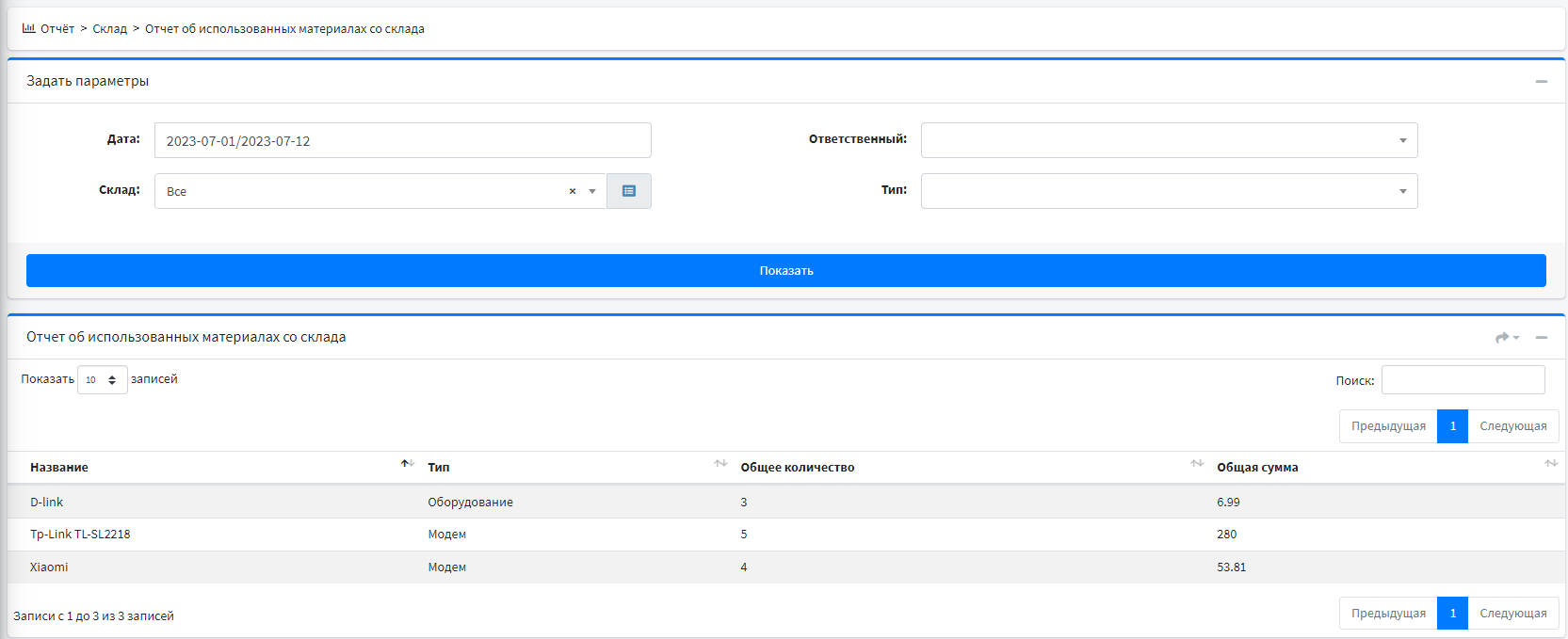 Отчет отображает общее количество списаний конкретного материала за месяц или любой другой указанный промежуток.