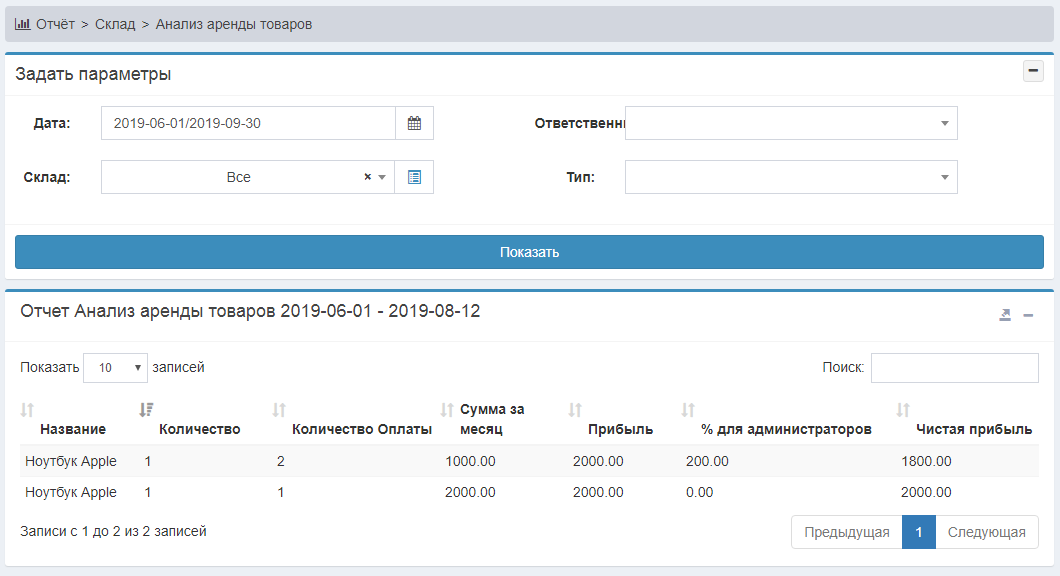 В отчете мы можем посмотреть сколько денег мы получили с товаров, которые находятся в аренде у клиентов. Изначально отчет открывается за сегодняшний месяц. При выборке за период, система считает сколько товар принёс в выбранные месяца.