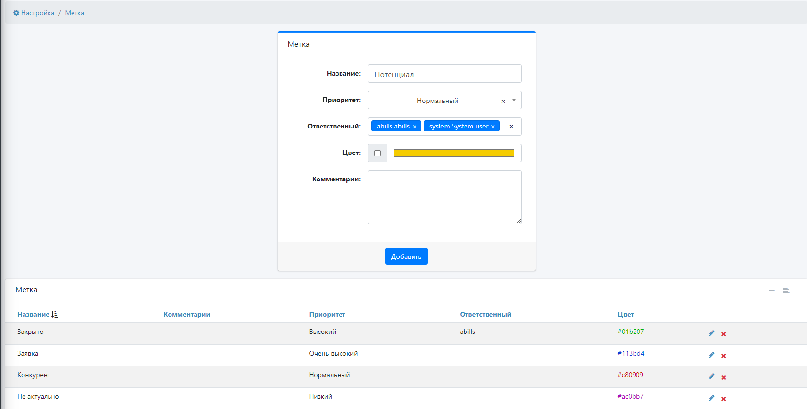 Создание тегов (меток) для абонентов осуществляется через меню Настройка>Метка.